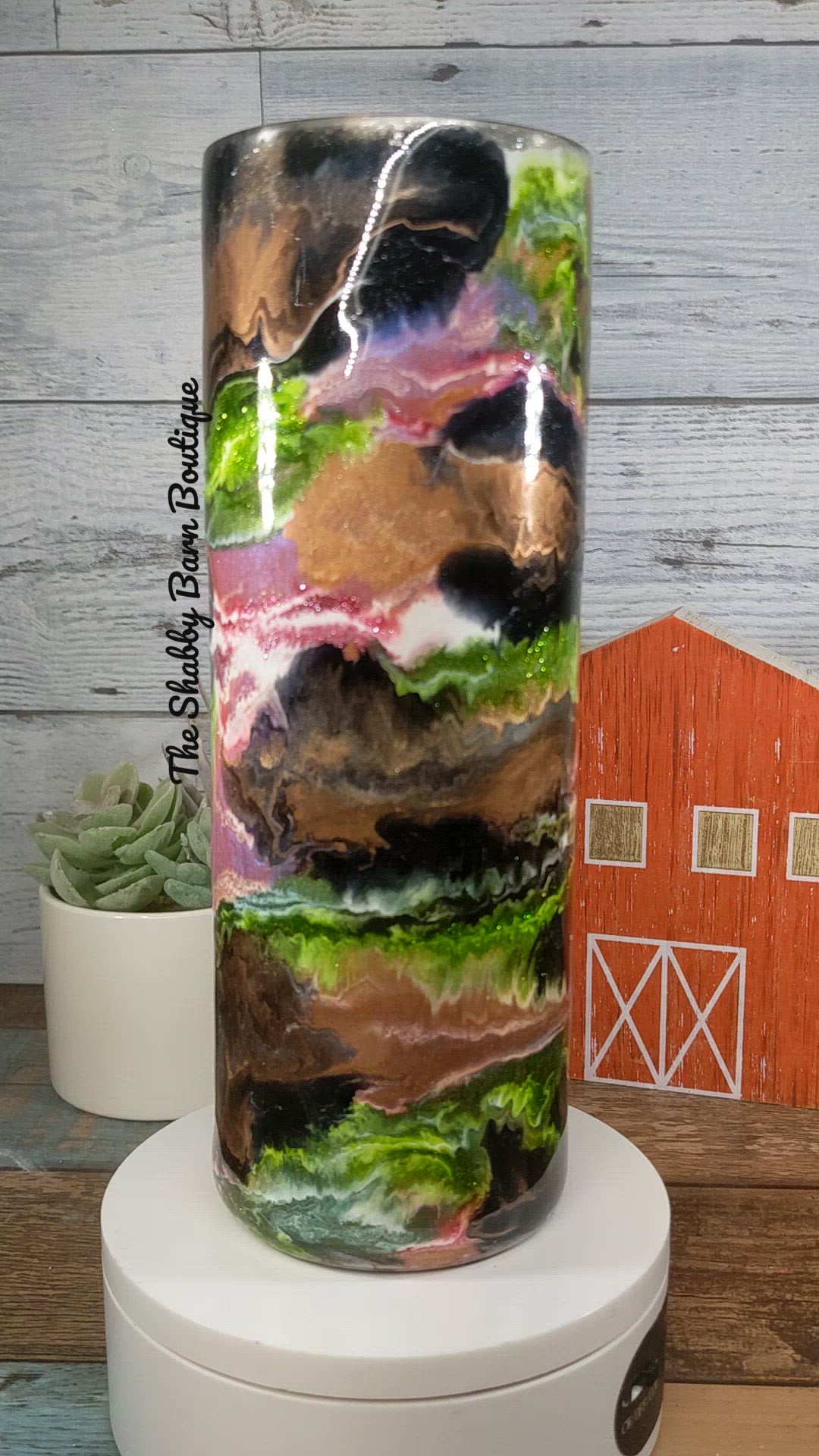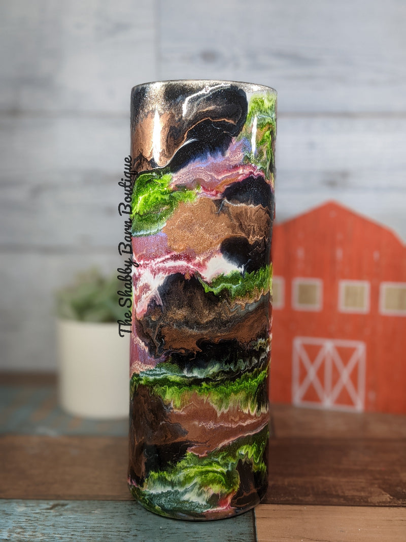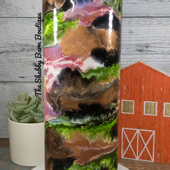 Indulge in a visual masterpiece with this Alcohol Ink & Mica Swirl tumbler. Bold swirls of green, gold, black, and pink flow together in an enchanting, one-of-a-kind design that catches the light and turns heads. It’s more than just drinkware—it’s a statement piece for your everyday routine.