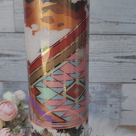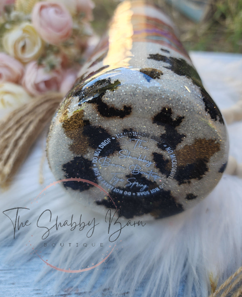 Bold and stylish, this Cow Print Southwestern tumbler combines vibrant mica powder and sparkling glitter for a standout look. Perfect for keeping your drinks hot or cold during any adventure.